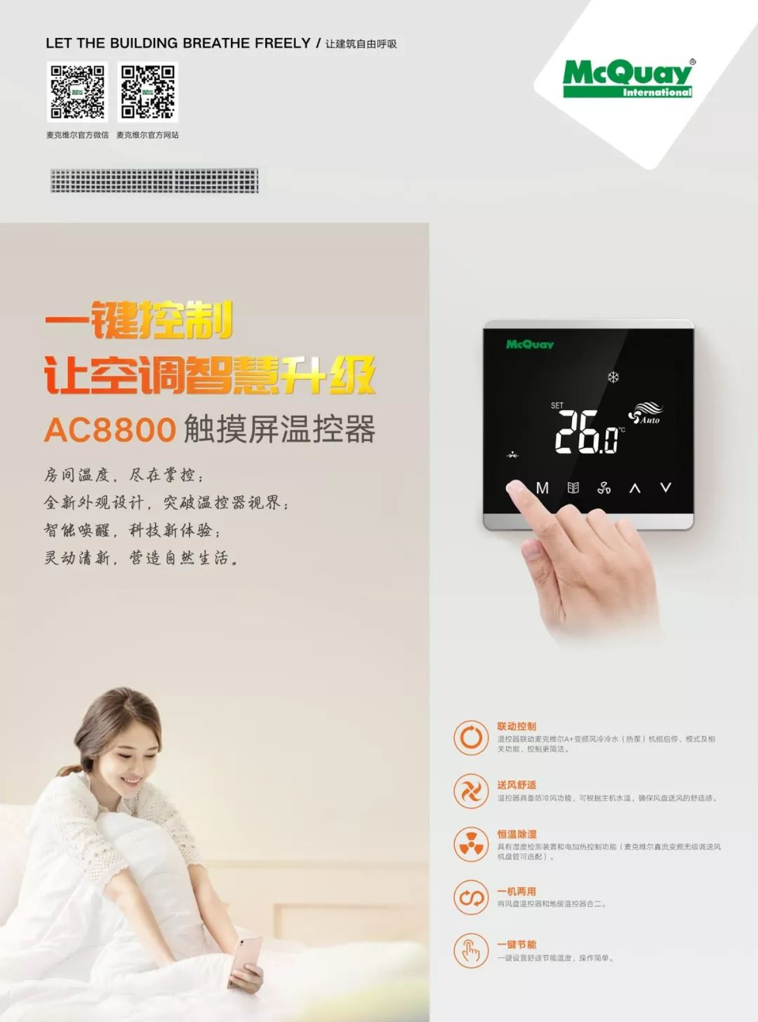 麦克维尔温控器AC8800/MC328(WiFi版),全新的感官设计,高清屏幕显示,触感细腻舒适,全面满足用户对温控器的各种需求。